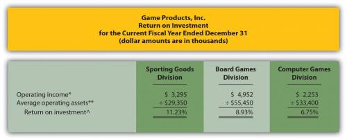 The ROI measures presented in Figure 11.5 "ROI Calculations (Game Products, Inc.)" show that although the Board Games division has the highest operating income, its ROI ranks in the middle of the three divisions. The Sporting Goods division has the highest ROI at 11.23 percent, Board Games is second at 8.93 percent, and Computer Games is the lowest at 6.75 percent. Since managers of each division are responsible for maximizing profit based on investments they make in assets, ROI is a reasonable approach to evaluating each manager. The Sporting Goods division manager appears to be outperforming the other two managers based on this measure.