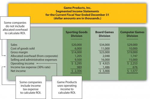 Answer: Figure 11.3 "Segmented Income Statements (Game Products, Inc.)" shows segmented income statement information for each of Game Products' three divisions. The operating income line of this income statement provides information needed for the numerator of the ROI calculation. Figure 11.4 "Segmented Balance Sheets (Game Products, Inc.)" presents the segmented balance sheets for each division needed to calculate average operating assets.