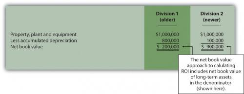 For example, assume two divisions have identical operating income for the year and identical assets. However, Division 1 has been in operation for many more years than Division 2 and thus has far more accumulated depreciation on long-term assets. This results in a lower net book value on long-term assets for Division 1 as shown in the following: