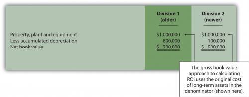 Assuming all other assets are identical, and both divisions have identical operating income, Division 1 will have a higher ROI simply because long-term assets are older and have more accumulated depreciation, thereby reducing average operating assets in the denominator. (Reducing the denominator increases the ratio.)