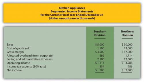 This is a continuation of Note 11.18 "Review Problem 11.3" for Kitchen Appliances. Recall that Kitchen Appliances has two divisions broken out by region—a Southern division and a Northern division. The following segmented income statement is for the most recent fiscal year ended December 31 (you were asked to prepare this income statement in Note 11.18 "Review Problem 11.3").