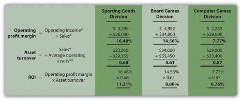 Answer: Operating profit margin, asset turnover, and ROI calculations for Game Products, Inc., are shown in Figure 11.7 "Operating Profit Margin, Asset Turnover, and ROI for Game Products, Inc.". Notice the resulting ROI for each division is the same as the ROI shown in Figure 11.5 "ROI Calculations (Game Products, Inc.)" except for slight differences attributed to rounding.
